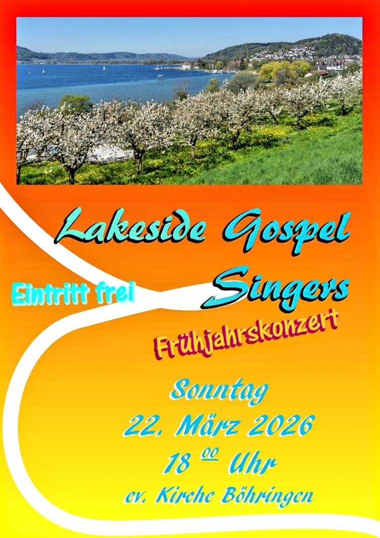Wir Lakeside Gospel Singers sind ein überkonfessioneller, gemischter Chor vom Bodensee. Von Gospelmusik begeisterte Sängerinnen und Sänger auch aus dem weiteren Umkreis treffen sich Donnerstags um 20 Uhr in der evangelischen Kirche in Radolfzell-Böhringen zu wöchentlichen Proben.